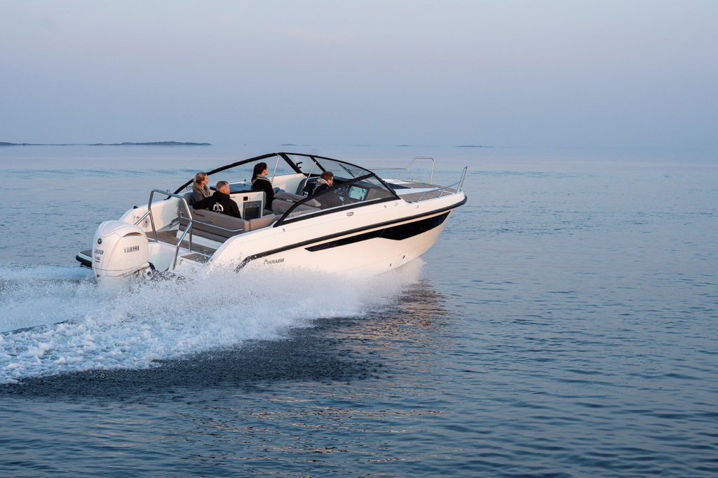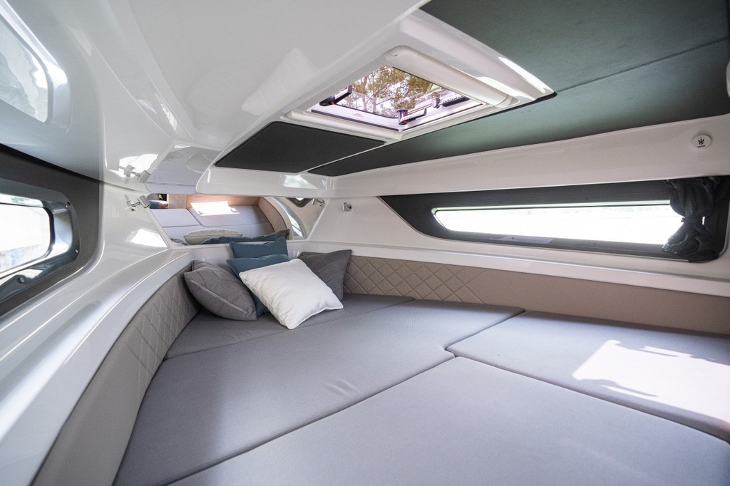 Sivulla, paapurin puolella, on perinteisistä daycruisereista poiketen kulku keulakannelle, jonka ansiosta veneeseen astuminen ja veneessä liikkuminen on erittäin helppoa ja turvallista. Tämän lisäksi isot sosiaaliset tilat, valoisa hytti, tilava mid cabin, isot uimatasot sekä loppuunsa hiottut ajo-ominaisuudet tekevät tästä uutuudesta mainion kumppanin päiväretkeilyyn ja pidemmillekin matkoille. Mukaan matkalle mahtuu jopa kymmenen henkilöä.